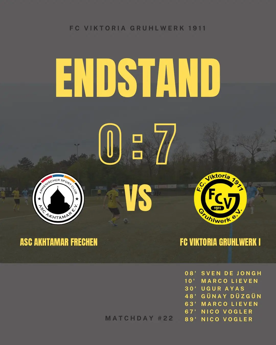 ⚽️SPIELBERICHT #22⚽️ 🥅 ASC Akhtamar Frechen 🆚 FC Viktoria Gruhlwerk I – 0:7 Ein unerwartet hoher Sieg gegen ASC Akhtamar Frechen! 🔥 Man muss sich schon die Augen reiben, was die Mannschaft Woche für Woche leistet.👀 Sie ist nicht zufrieden damit, nur zu gewinnen – sie will immer weiter